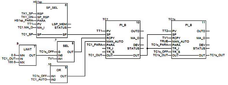 Inputsперед секцієюTC1_LOOP, де зміннійTT1aприсвоїться значення вхідного аналогового каналуOutuptsпісля секціїTC1_LOOP, де значення вихідного аналогового каналу присвоїться зміннійTV1b
