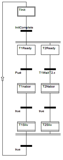 Опишемо поведінку системи через механізм мережі Петрі (рис.61). Роботу програми можна описати через чотири стадії (кроки): очікування старту (початкова стадія), наповнення рідиною, добавлення ферментів, злив продукту. Під час кожної стадії положення виконавчих механізмів чітко означено: наприклад при наповненні рідиною kl1 повинен відкритися. Перехід зі стадії на стадію відбувається по певним умовам: наприклад система переходить на стадію “наповнення рідиною” тільки після стадії “очікування старту” та умови переходу “якщо нажата Start”. Таким чином стадії в мережі Петрі є позиціями, а умови – переходами. Коли активується певний крок, він отримує маркер від кроку що деактивується. На рис.61 маркер знаходиться у кроку “Наповнення рідиною”. Порівняйте програму керування написану на мові SFC з моделлю системи на базі мережі Петрі.