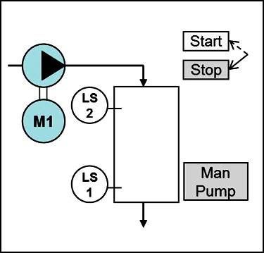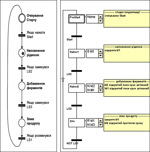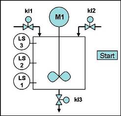 Після натискання кнопки START, клапан kl1 відкривається і апарат заповнюється рідиною до спрацювання LS2. Після цього включається мішалка, і відкривається клапан kl2 для подачі ферментів. Після спрацювання давача LS3, клапани та мішалка відключаються, відкривається клапан kl3, і продукт зливається з апарату. Коли апарат порожній (LS1 відключений) клапан kl3 закривається, і система переходить в початковий стан.